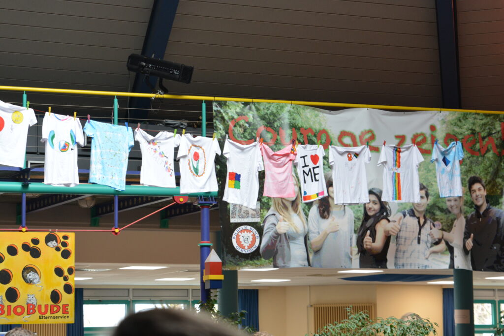Am Ende der Workshops wurde im Hauptgebäude der IGS ein Markt der Vielfalt veranstaltet. Dabei wurden die Arbeit der Workshops auf Stellwänden dokumentiert und die Ergebnisse auf Plakaten, aber auch Produkte, wie der Balkon der Vielfalt, bunt gestaltete T-Shirts und Rucksäcke, Bilder auf Leinwänden, kleine Skulpturen, Spiele anderer Kulturen und Vieles mehr präsentiert. Sehr eindrucksvoll waren die Fabeln, Szenen und kleinen Theaterstücke auf der Bühne im Forum, die von vielen Zuschauer*innen gebührende Wertschätzung erhielten.