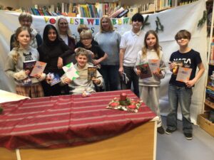 Tristan (6a), Lia und Marvin (6b), Selina und Tom (6c) sowie Karl und Amelie (6d) fanden sich in der Schulbücherei ein, die von unserer Bibliothekarin Karin Witte stimmungsvoll dekoriert worden war.